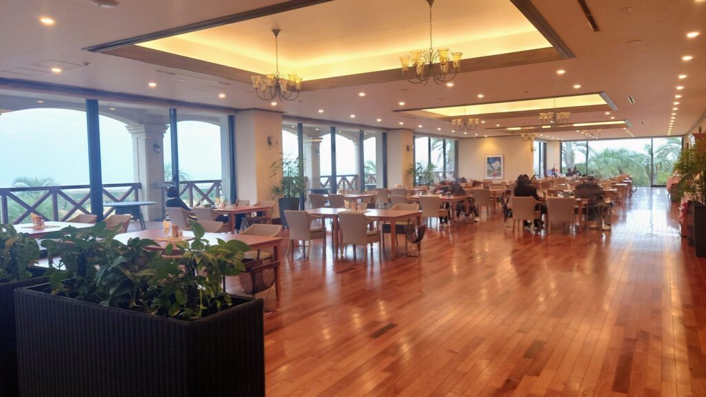 大きな窓から差し込む自然光と、外に広がるヤシの木が心地よく揺れる景色を眺めながら、ゆったりと食事ができるレストランスペース。