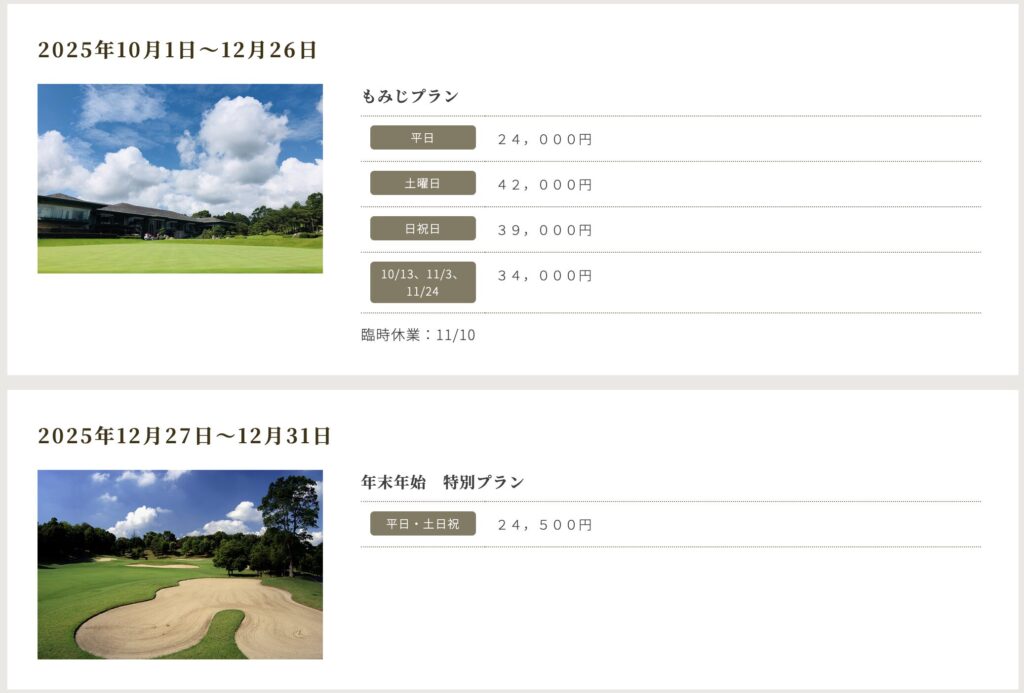 - 平日グリーンフィー無料券:1ラウンドキャディ付徒歩プレーが8,100円(メンバー同伴料金)