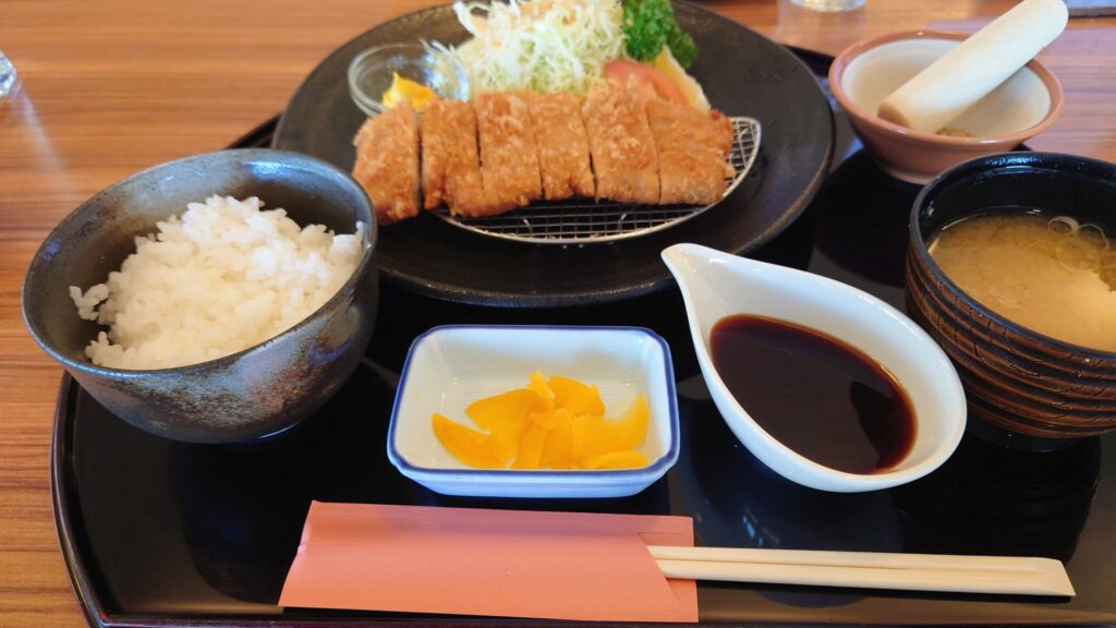 この日いただいたのは、揚げたてサクサクのロースかつ膳ご飯、味噌汁、漬物、すりごま付きで、ソースをかけて自分好みに仕上げられるのも嬉しいポイントです!