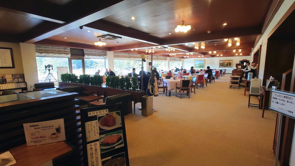 クラブハウス内のレストランは、天井がやや低めで組数も少ないため、落ち着いたこぢんまりとした空間。